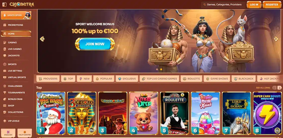 Cleobetra tilbyr et stort og variert spillutvalg på over 8500 title totalt. Du finner tusenvis av casinospill direkte i nettleseren, inkludert et omfattende utvalg av slots med ulike temaer som egyptisk mytologi, klassiske favoritter og nye populære titler. Spillene er sortert i kategorier som «Top», «New», «Popular» og «Exclusive», og mange kan prøves i demoversjon før du spiller for ekte penger. Hovedfokuset ligger på spilleautomater på nett, men du finner også bordspill og live casino fra flere internasjonale leverandører.